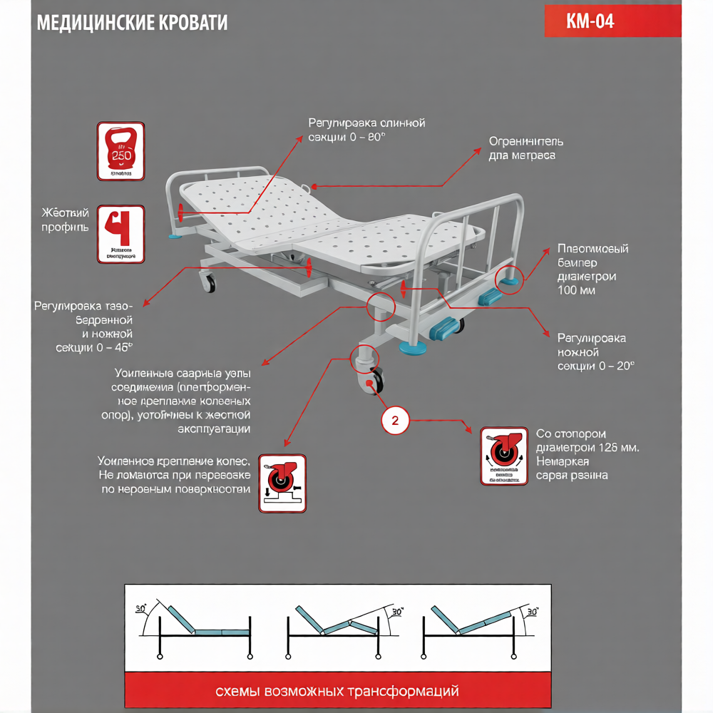 Медицинская кровать КМ-05 - функциональная медицинская кровать с механической регулировкой секций.