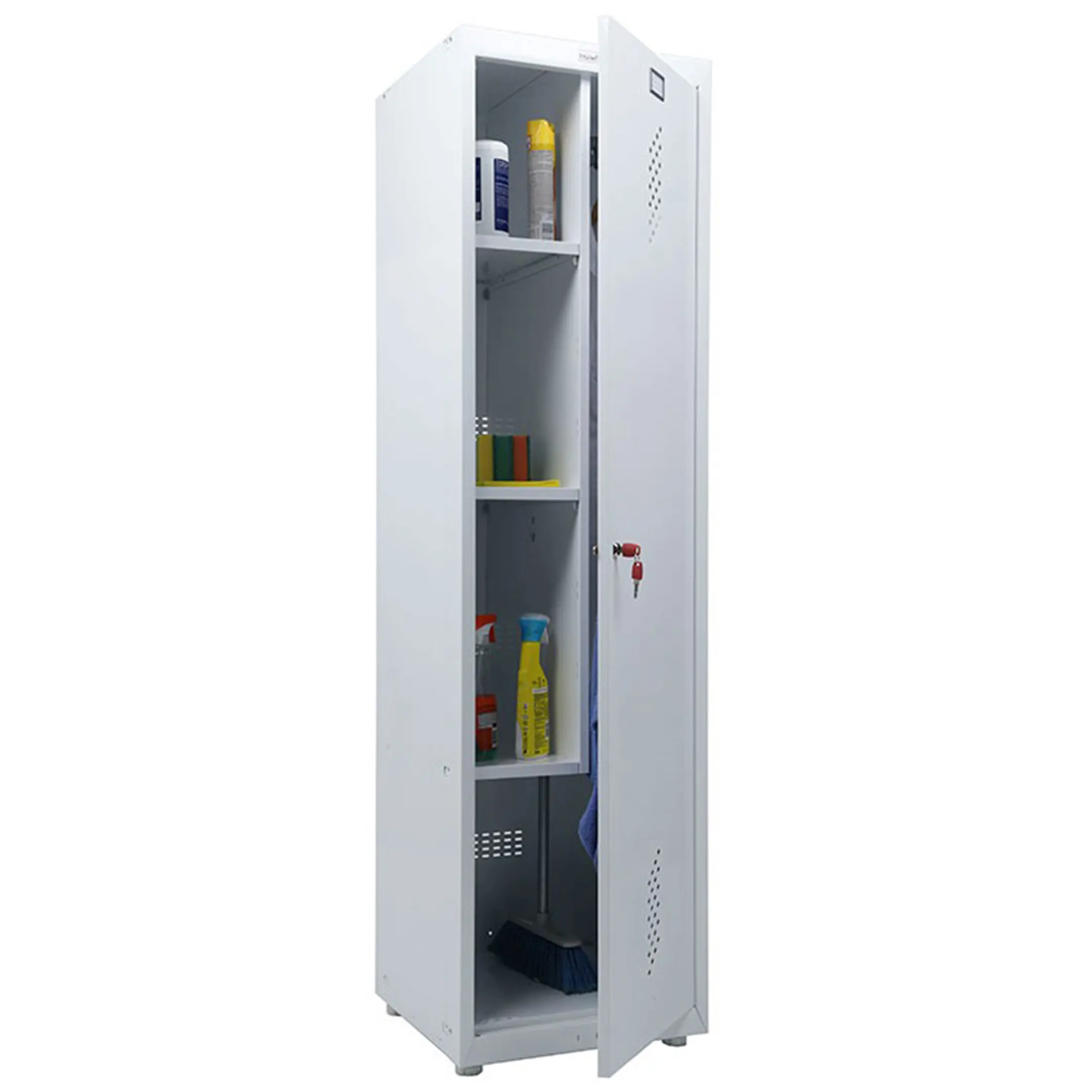 • Комплектация: вертикальная перегородка, 3 полки под хозяйственный инвентарь, держатель для швабры, крючки для одежды, перекладина для плечиков;