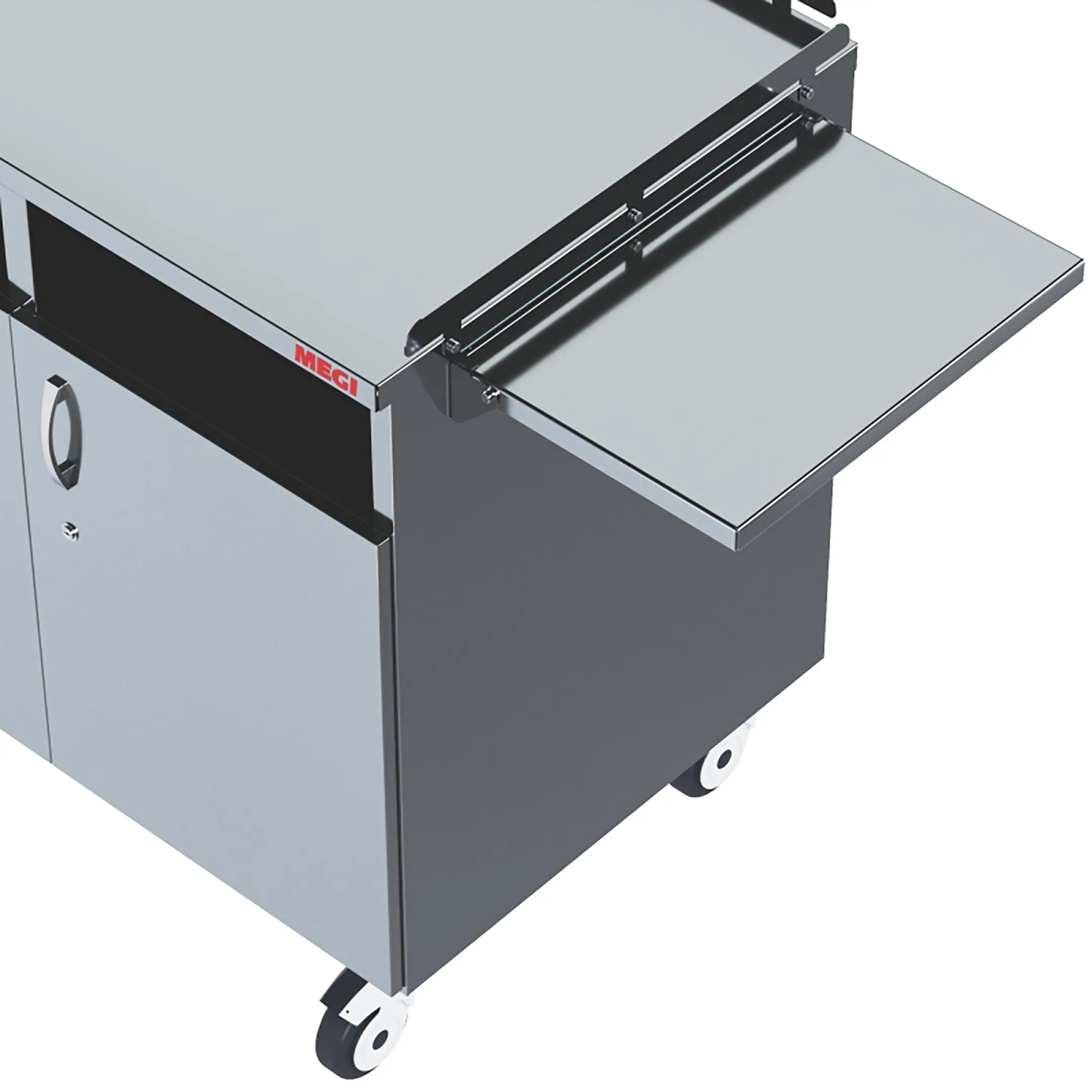 • колеса поворотные, самоориентирующиеся, диаметром 100 мм, комплектуются надёжной стальной вилкой с прецизионным радиально-упорным подшипником, ободом из полипропилена и шинкой из серого полиуретана, не оставляющего следов на полу, два колеса – с индивидуальным тормозным устройством;