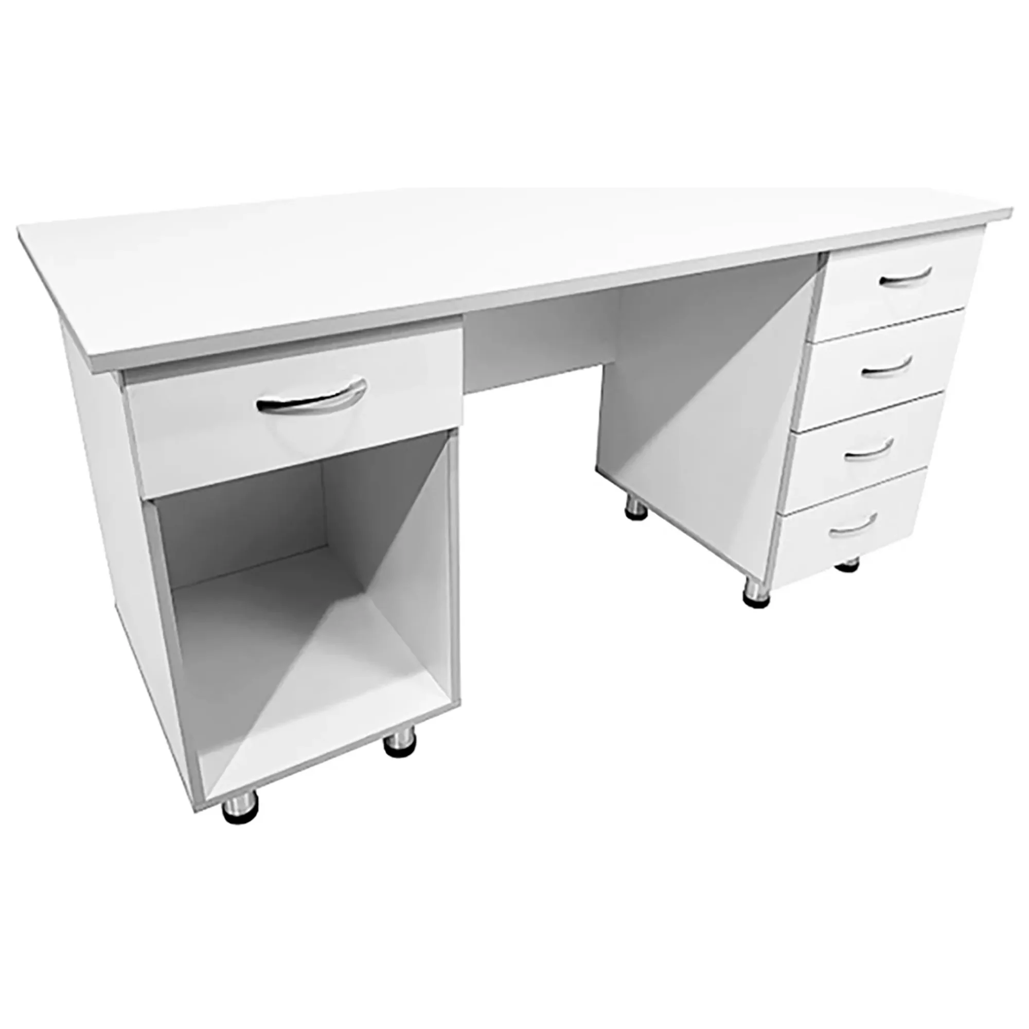 • Одной из особенностей этого стола является его конструкция с двумя боковыми тумбами. Одна тумба оснащена выдвижным ящиком и нишей, а вторая - четырьмя выдвижными ящиками, что обеспечивает удобное размещение и хранение различных предметов и документов. Отличительной чертой модели является белый цвет ЛДСП с кромкой светло-серого оттенка, придающий столу современный и профессиональный вид.