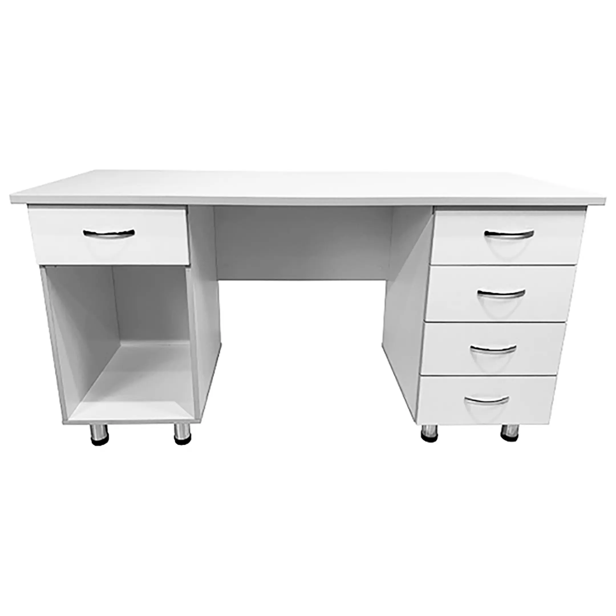 • Размеры стола и внутренних частей продуманы до мелочей: от размеров тумб и ящиков до расстояний от пола до верхней и нижней кромок рабочей плоскости. Ручки-скобы хромированные размером 96 мм добавляют столу стиль и элегантность, а регулируемые по высоте опоры позволяют настроить высоту стола согласно вашим предпочтениям.