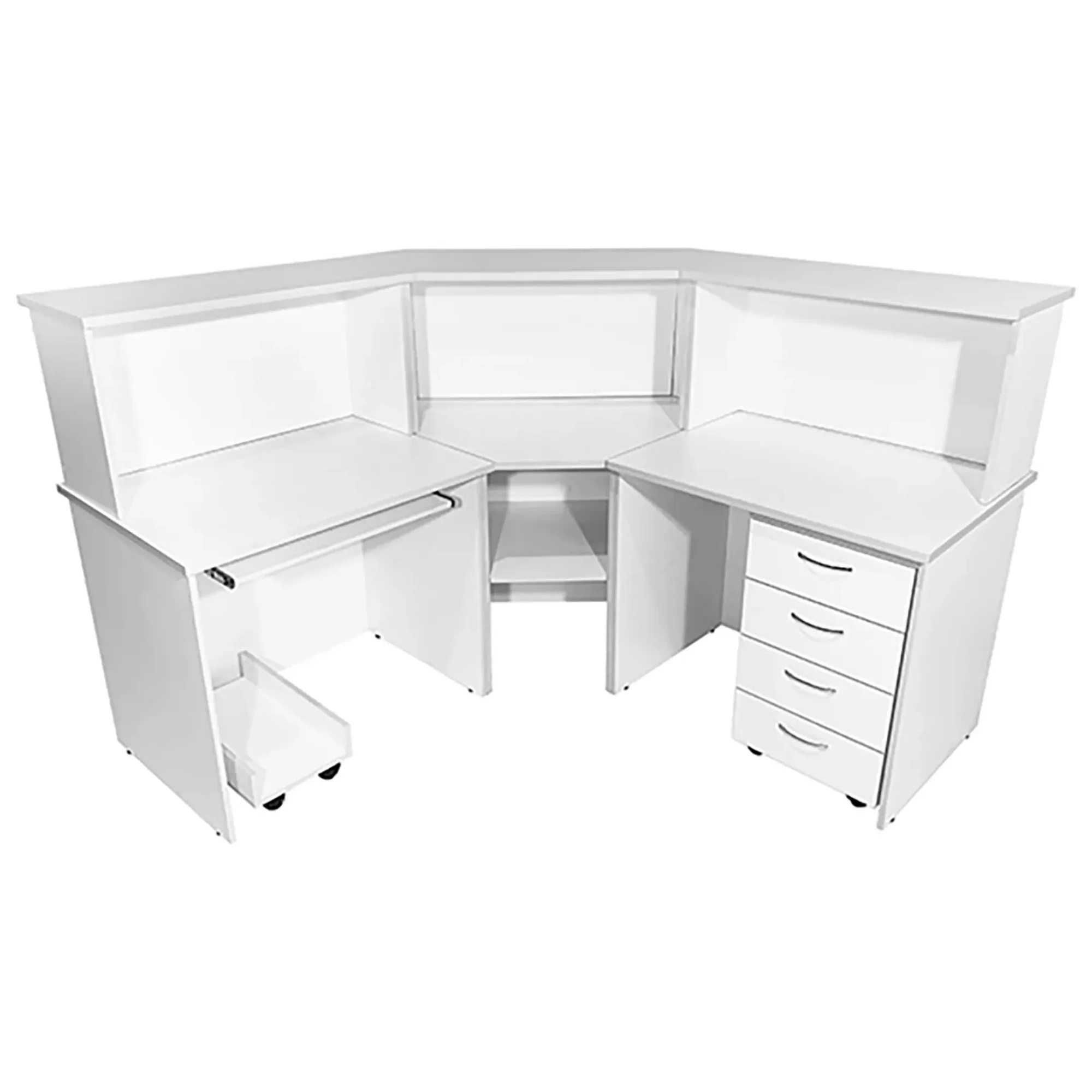 Стол-пост медицинский MD СтП 11.01 (белый) — это надежное и функциональное угловое решение для создания удобного рабочего места администратора в медицинских учреждениях. Модель выполнена из ЛДСП, имеет надстройку сверху, нишу под угловой столешницей, платформу для системного блока, полку для клавиатуры слева и тумбу с четырьмя выдвижными ящиками.