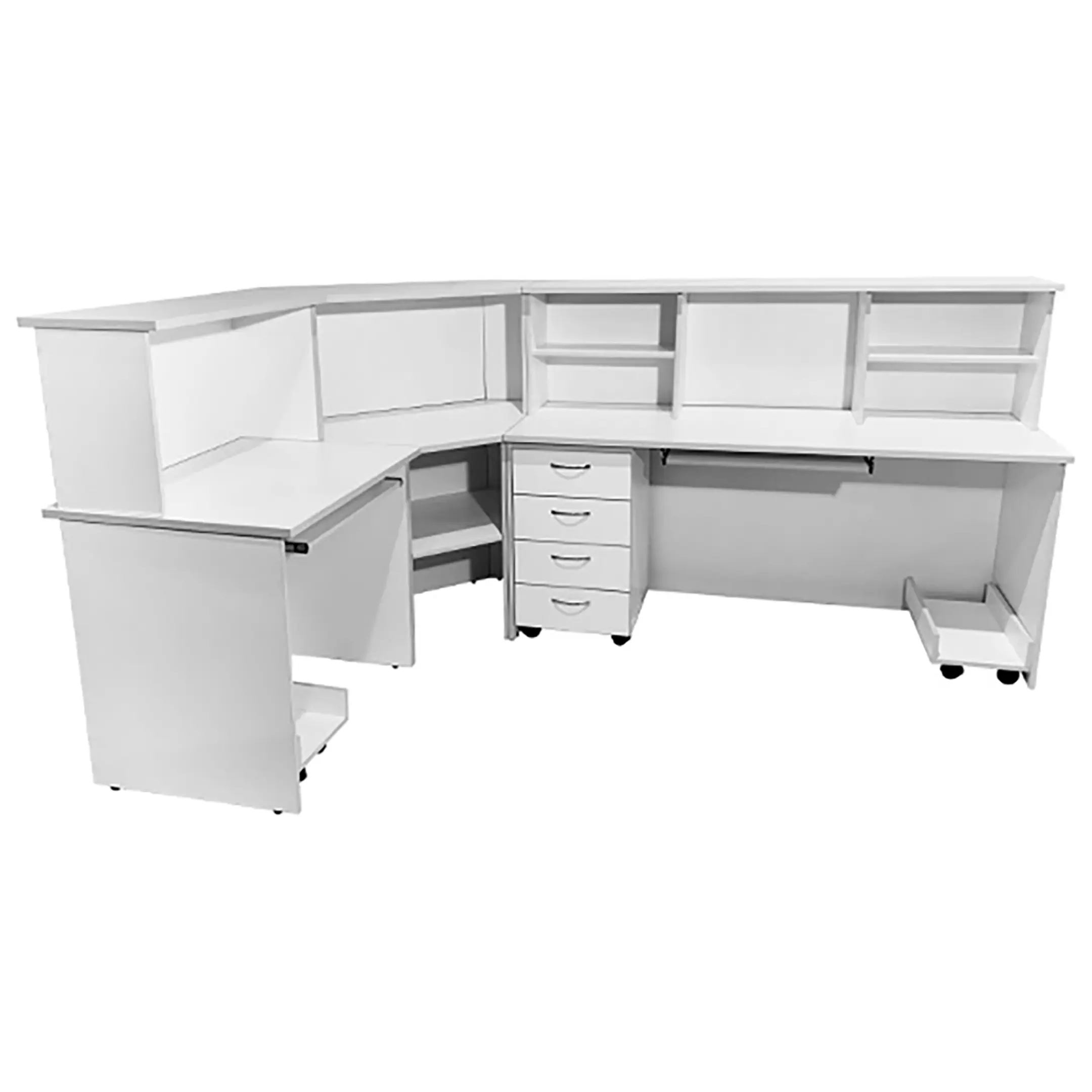 Стол-пост медицинский MD СтП 11.03 (белый) — это надежное и функциональное угловое решение для создания удобного рабочего места администратора в медицинских учреждениях. Модель выполнена из ЛДСП, имеет надстройку с полками, подкатную платформу для системного блока, полки для клавиатуры слева и справа, а также тумбу с четырьмя выдвижными ящиками и дополнительными полками.