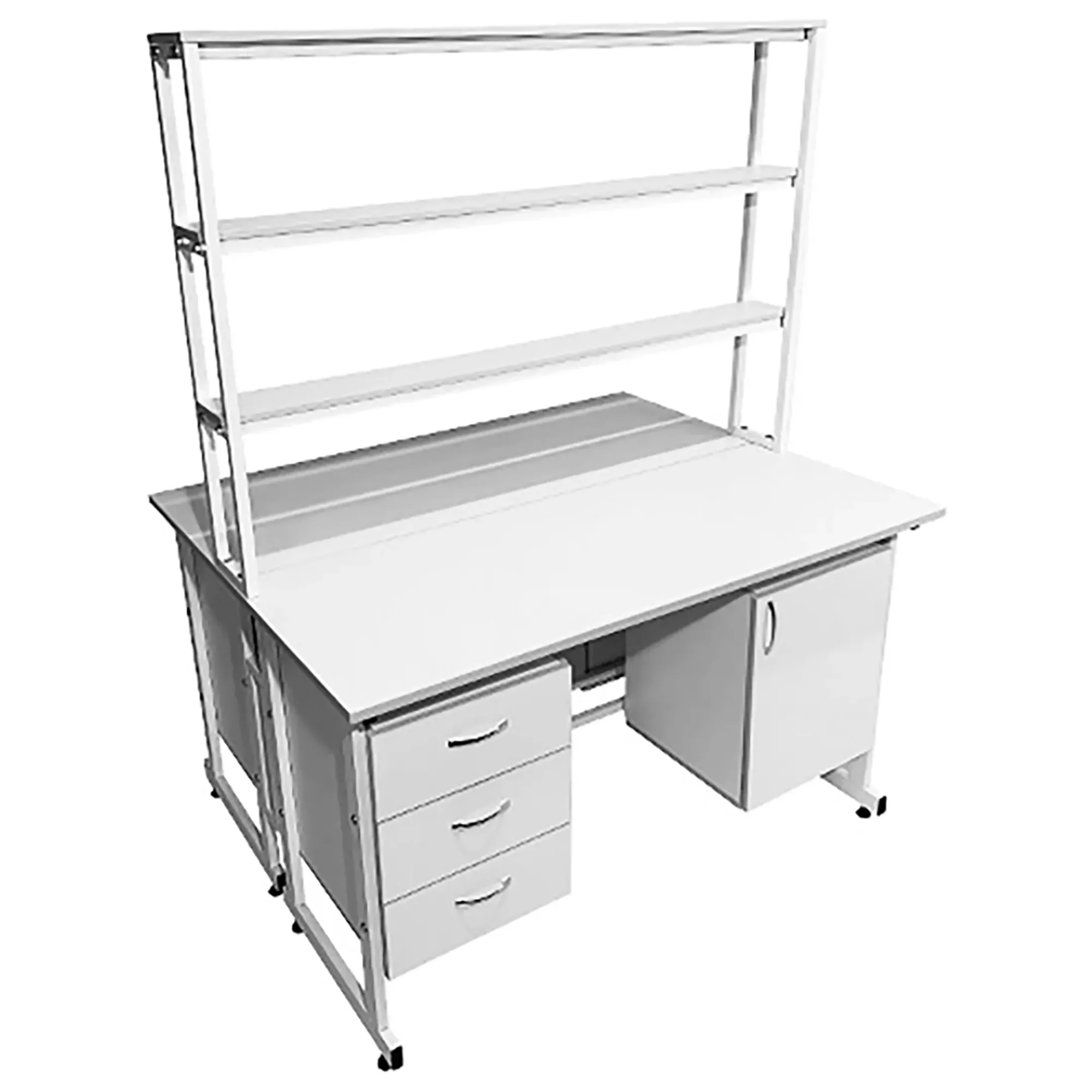 Стол лабораторный островной с надстройкой Сло 22.024 (белый) — это универсальное и практичное решение для организации рабочих мест в медицинских учреждениях и научных лабораториях. Модель обеспечивает возможность разместить два полнофункциональных рабочих места, помогая оптимально использовать доступное пространство. Каждое рабочее место оснащено двумя подвесными тумбами с ящиками и полками, а центральная надстройка имеет три полки. Каркас выполнен из стального профиля, столешницы из ЛДСП толщиной 22 мм.