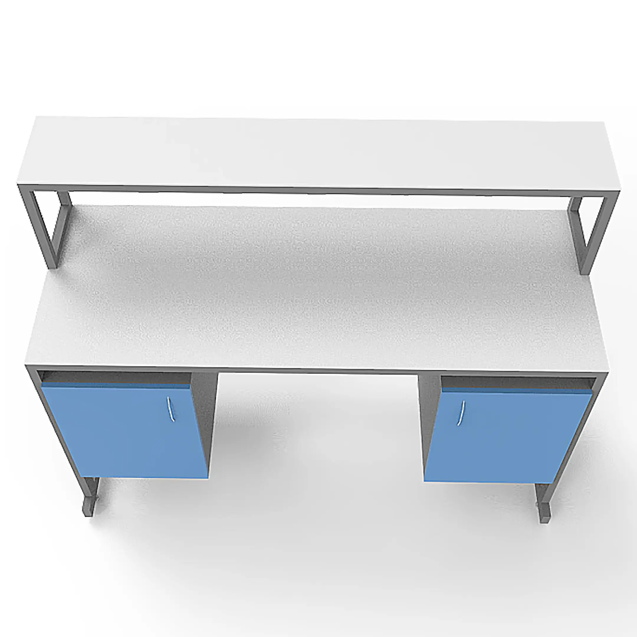 - Удобная система хранения — две тумбы под столешницей с дверцами для хранения материалов и оборудования, надстройка с полкой.