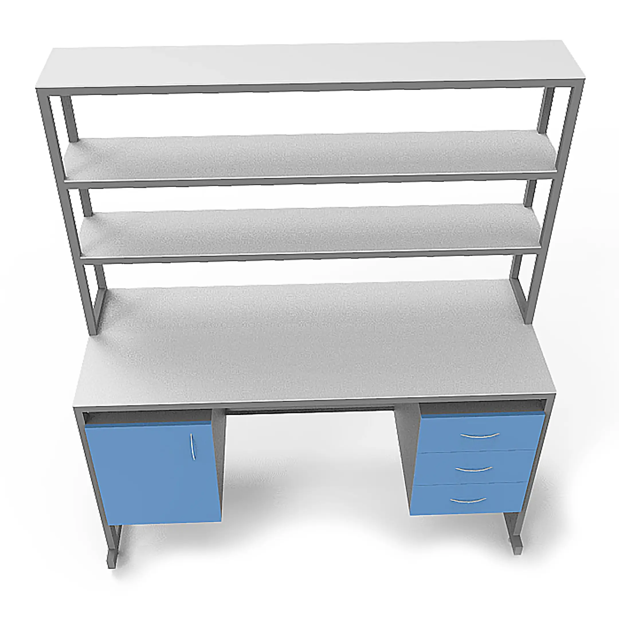 - Функциональная надстройка — две полки для дополнительного размещения оборудования, общая высота стола с надстройкой 1850 мм.