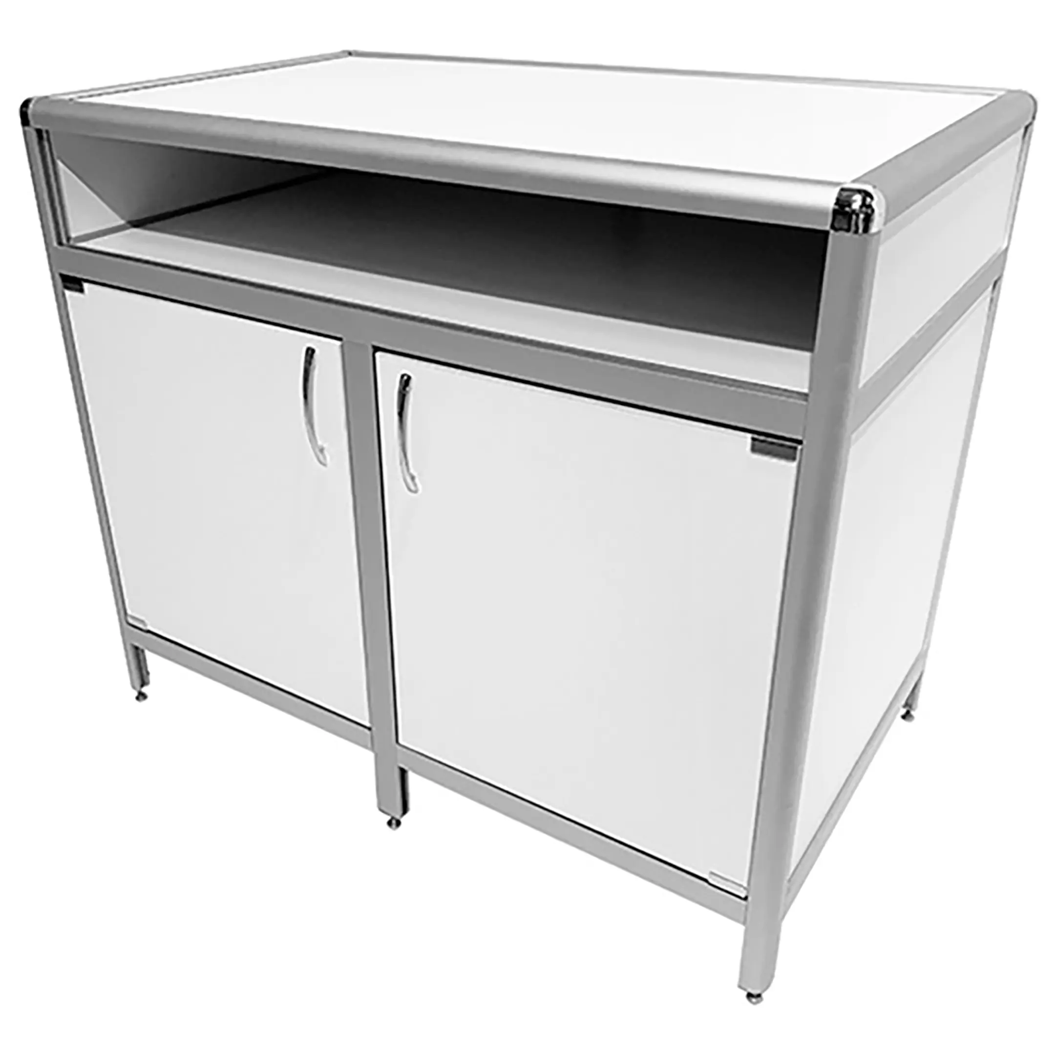 Стол-тумба лабораторная MED 12.009al (белый) — это функциональное решение для хранения лабораторного инвентаря, приборов и материалов в лабораториях и медицинских учреждениях. Модель оснащена вместительной нишей под столешницей (940х540х139 мм) и двумя тумбами с распашными дверками и полками внутри (полки 463х545 мм). Каркас выполнен из алюминиевого профиля, столешница из ЛДСП толщиной 16 мм.