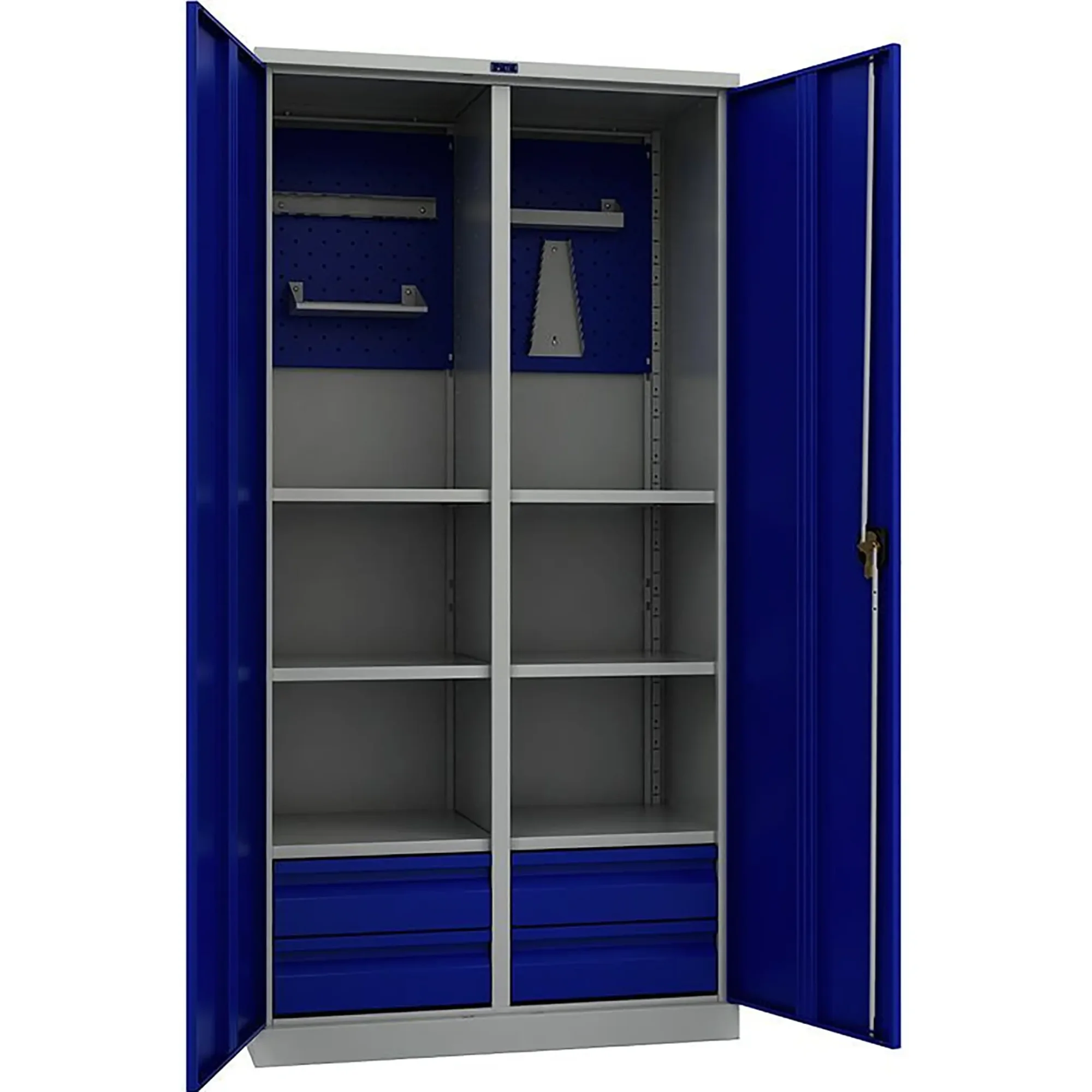 - Промышленная прочность и износостойкость — шкаф изготовлен из качественной стали с прочным порошковым покрытием, устойчивым к ударам, царапинам, воздействию масел, технических жидкостей и интенсивной эксплуатации.