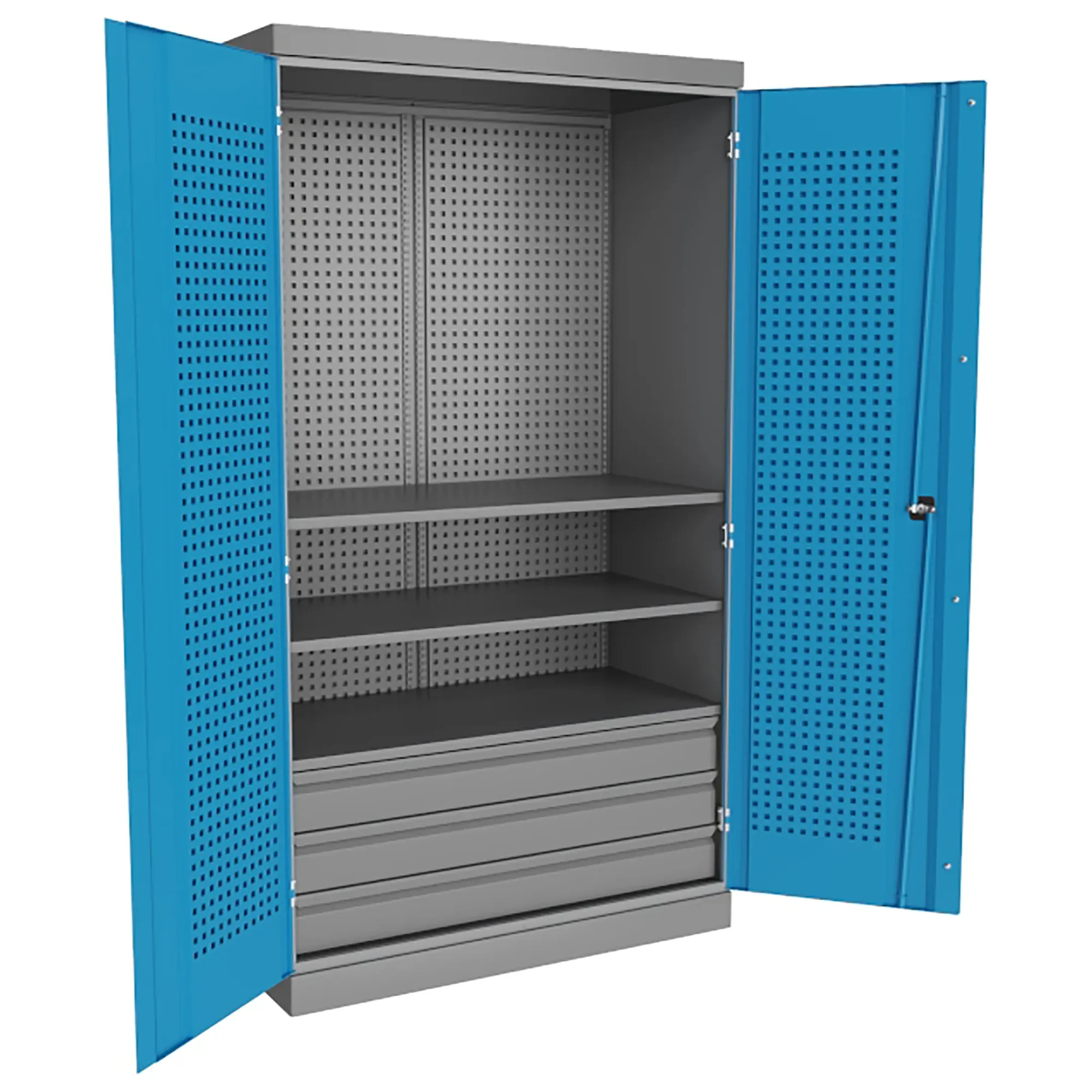 - Защита от производственных загрязнений — закрывающиеся дверцы шкафа надежно защищают чистый и точный инструмент от цеховой пыли, металлической стружки, влаги и масляных испарений, что крайне важно для сохранения его рабочих характеристик и срока службы.
