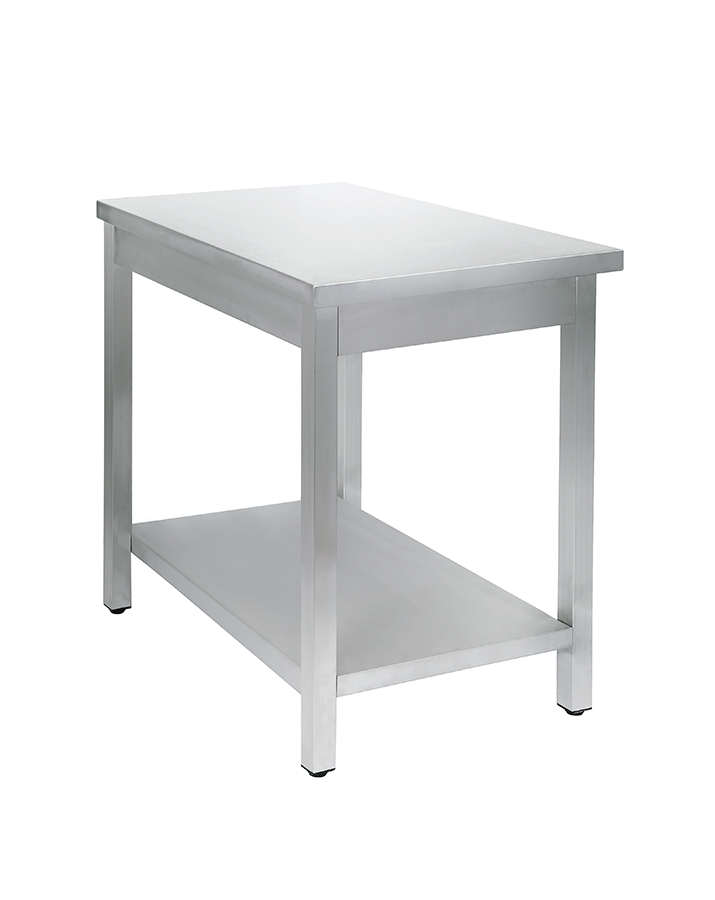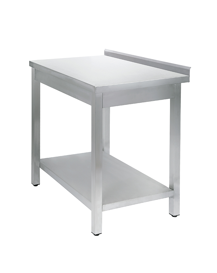 Стол сделан из нержавейки. Усилен дополнительной сплошной полкой. Оснащен съемным бортом, за счет чего ставить его можно и у стены, и посередине производственного помещения.