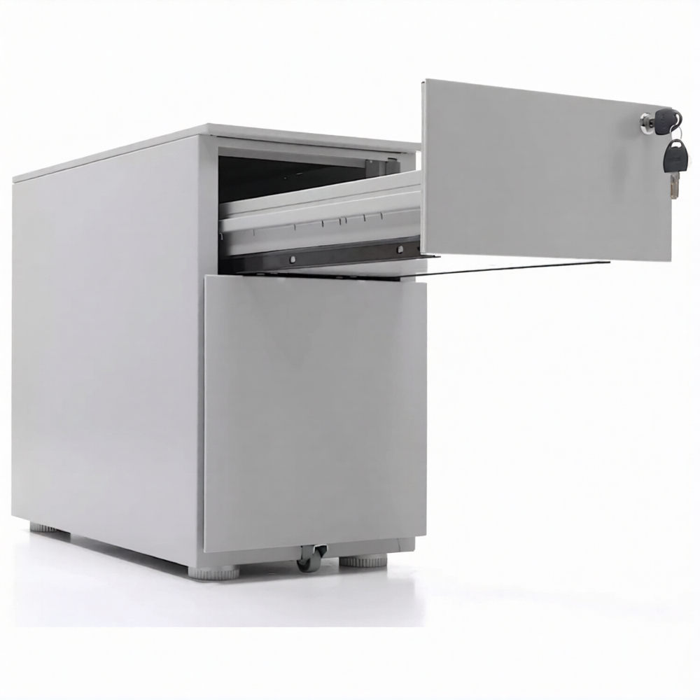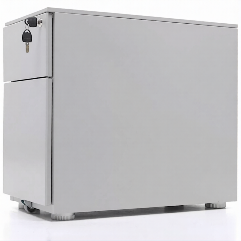 Опции: пластиковые лотки и металлический ящик для канцелярских принадлежностей и других предметов. Возможность комбинирования цветов: корпус + фасады ящиков и крышка (конструкция тумбы металл+металл). Или отделка фасадов ящиков и крыши тумбы ламинированной плитой ЛДСП (конструкция тумбы металл+ЛДСП)