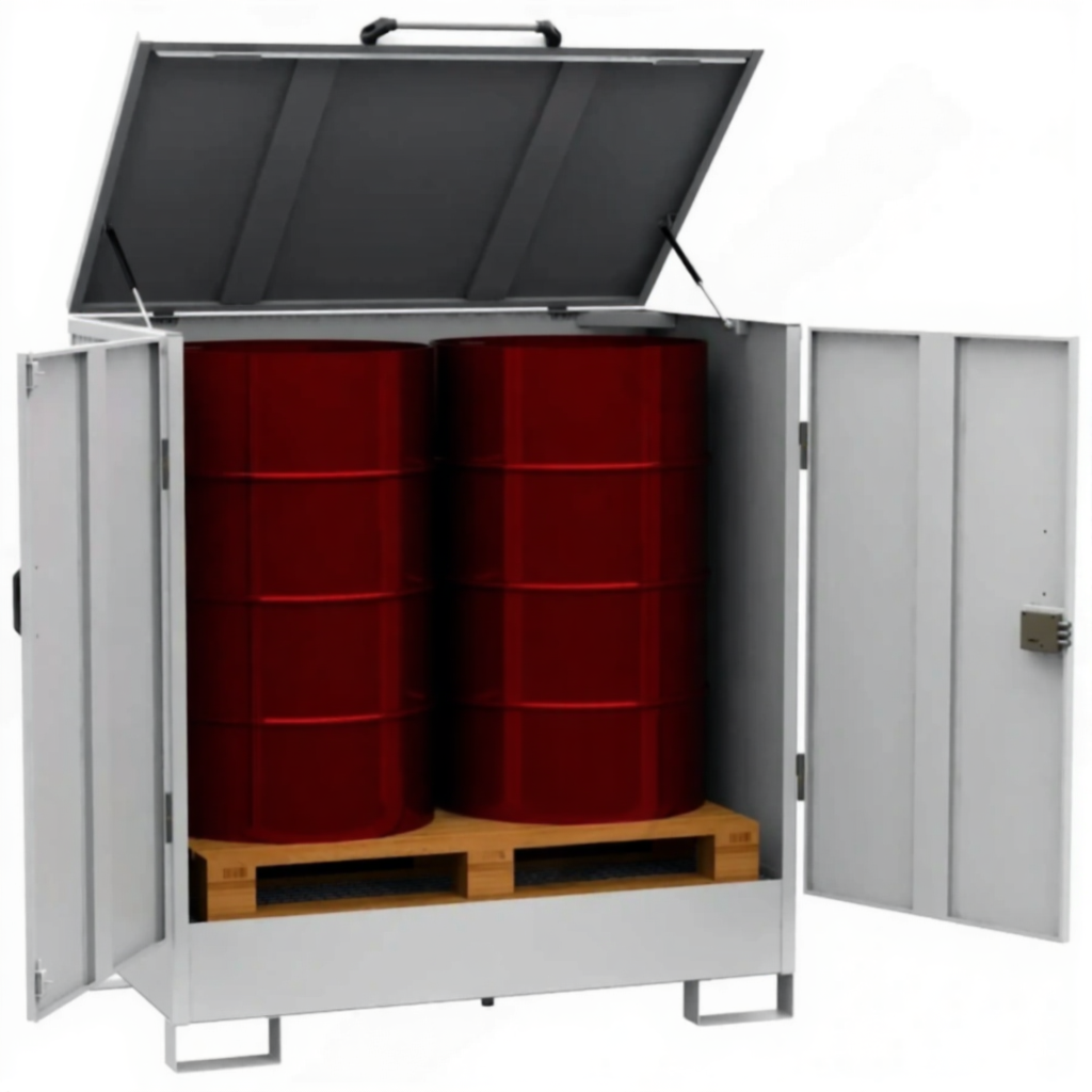 Преимущества депо для 2-х бочек, оцинкованный решетчатый настил, сточный поддон