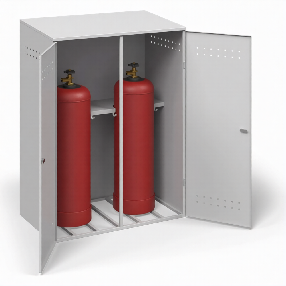 - Специализация для горючих газов (пропан, пропан-бутан) — шкаф серии «ШГБП» спроектирован с учетом специфики хранения сжиженных углеводородных газов (СУГ). Его конструкция, система вентиляции и общие требования к безопасности соответствуют строгим нормативам для данного типа топлива, что отличает его от универсальных шкафов.