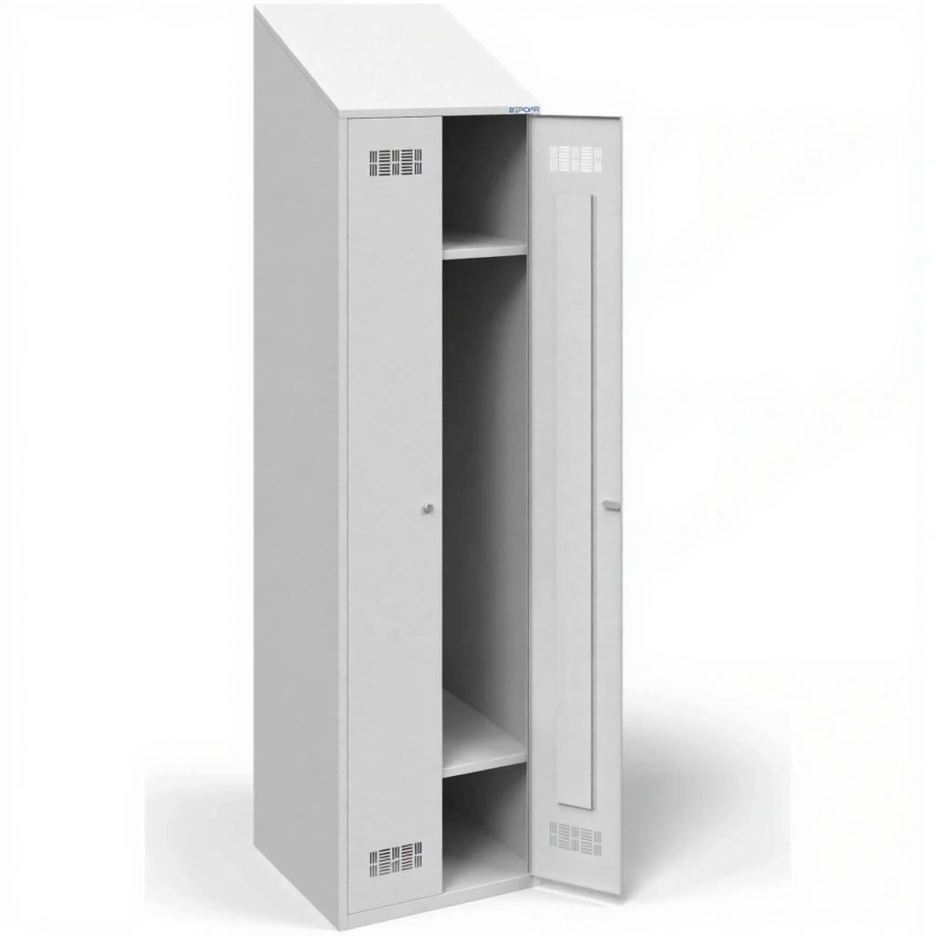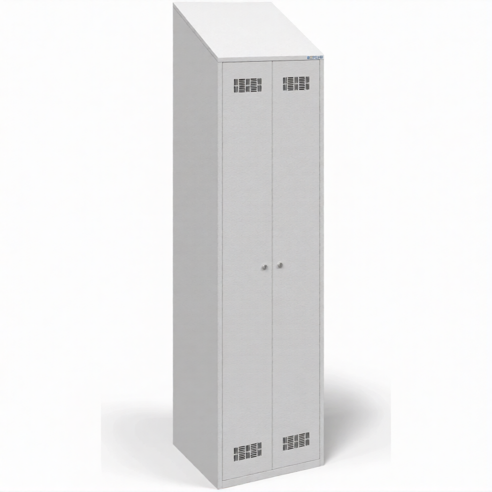 • Шкаф для одежды с наклонной крышей прекрасно подходит для оборудования раздевалок на различных промышленных и торговых предприятиях. Он позволяет хранить как чистую, так и грязную одежду.