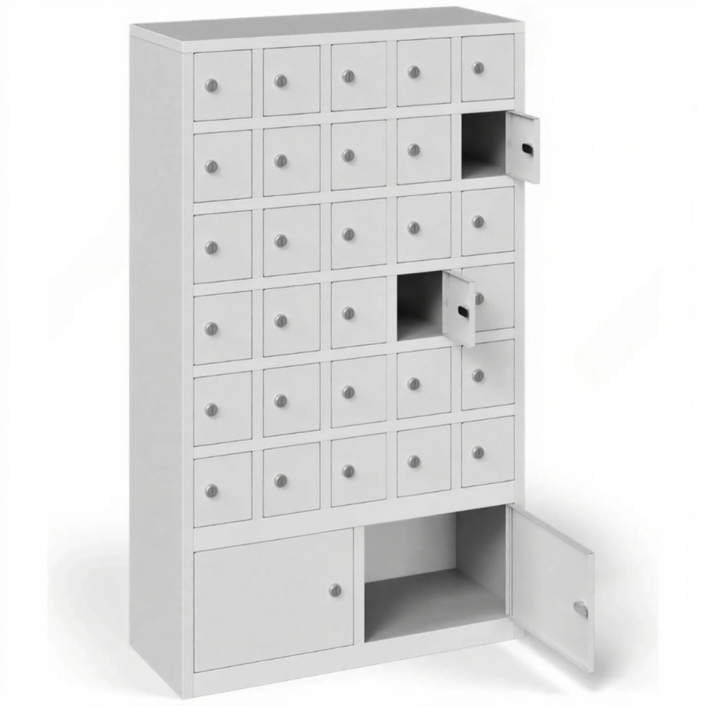 - Повышенная функциональность и организация пространства — наличие специализированных ячеек избавляет от необходимости искать отдельные решения для хранения разных типов предметов. Все хранится в одном безопасном и организованном месте, что экономит пространство в помещении и упрощает контроль.