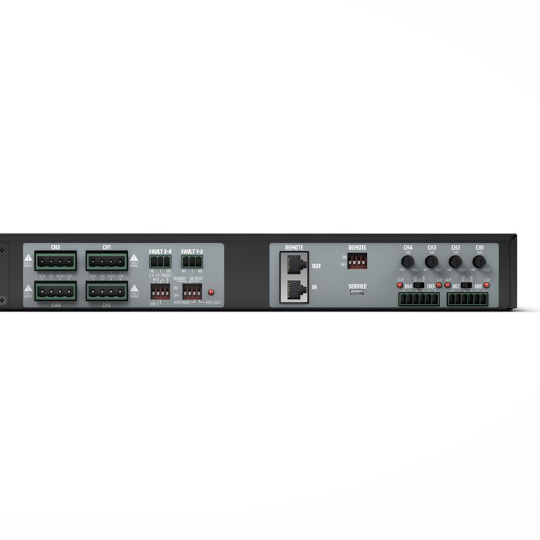 • Усилитель мощности класса D c 4 каналами x 240 Вт @ 4 Ом/100В/70В